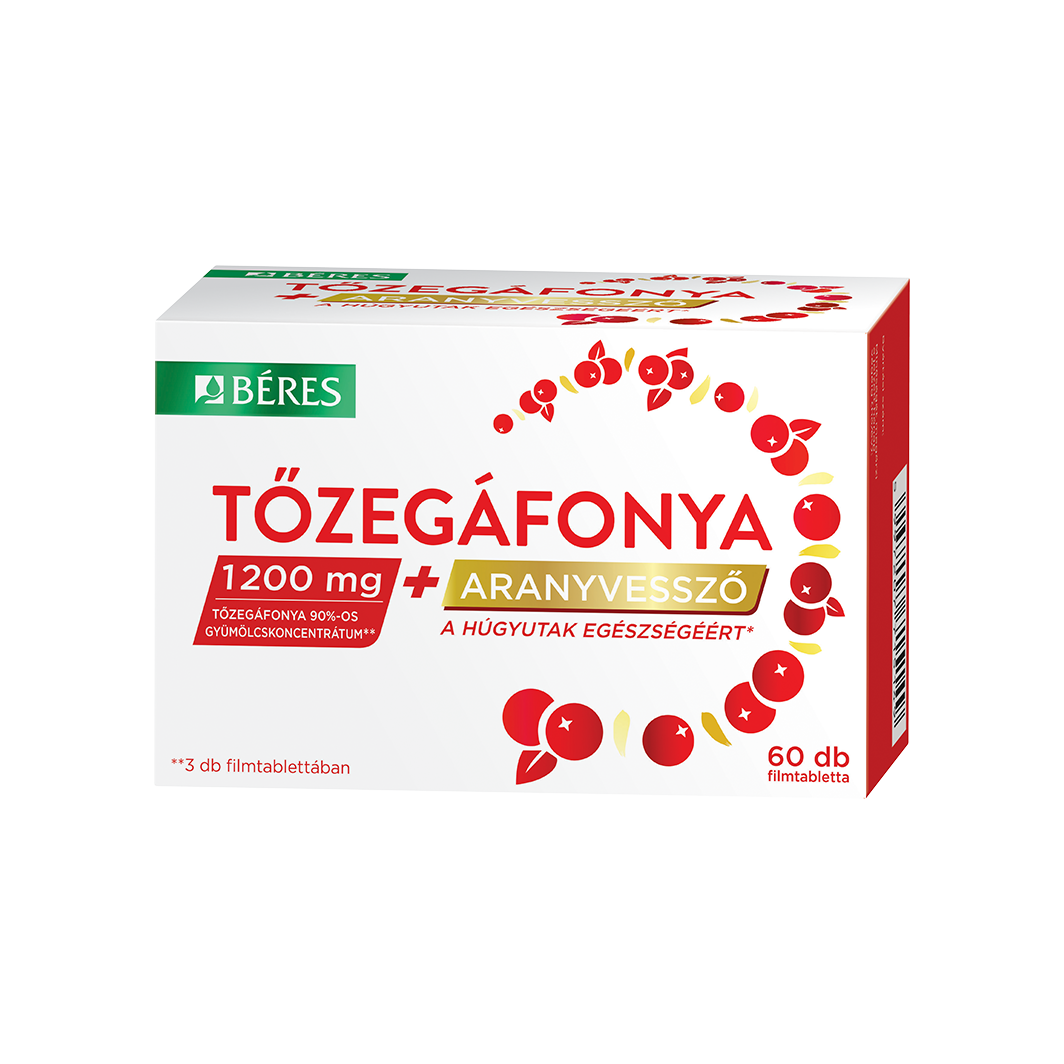 1200 mg tőzegáfonya 90%-os gyümölcskoncentrátum, valamint 75 mg aranyvessző kivonat a napi adagban (3 filmtabletta).